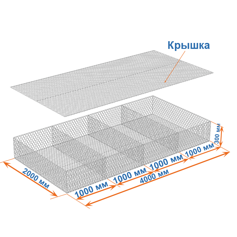 Пример применения: укрепление откосов и русел на типовых участках; заполнение камнем фракции крупнее 60х80, фиксация крышек и кромок после выверки отметок.